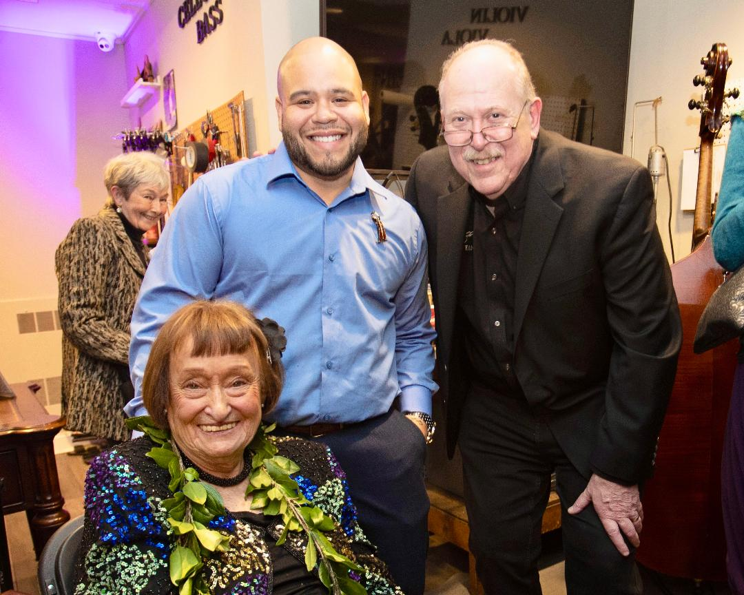 Jazz vocalist icon Sheila Jordan celebrates her 95th birthday with two of her biggest fans: Manny Alvarez (center) and Barrie Kolstein of Kolstein---celebrating its 80th birthday!