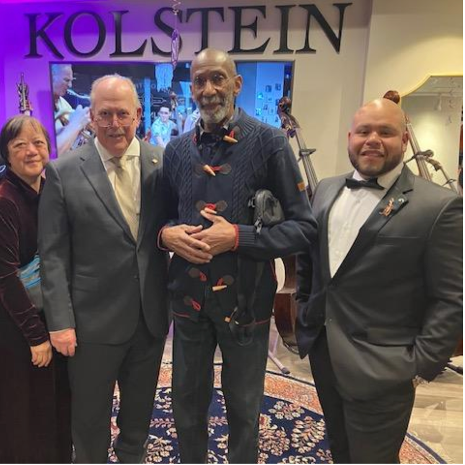 Madalena Kozol, 14 of Boston (Roslindale), Massahusetts, receives the Kolstein Double Bass donated from Barrie Kolstein (left) and Manny Alvarez, President of Kolstein, Inc. This five-string Kolstein Grant Panormo was awarded to Madalena by the International Society of Bassists June 2023.Watch Now